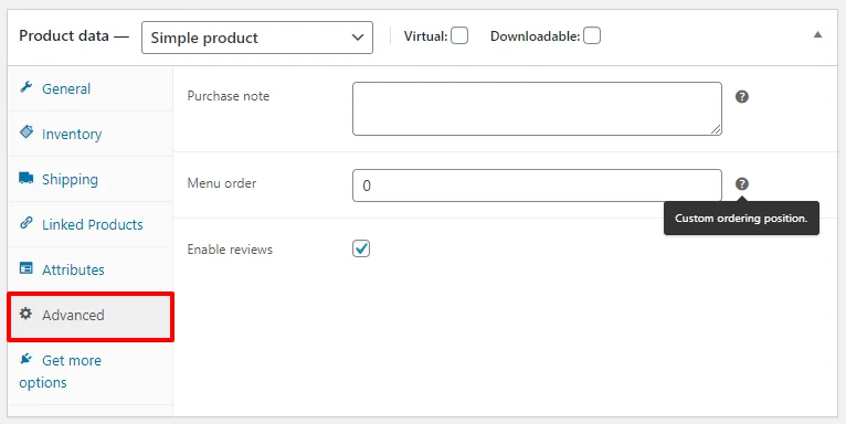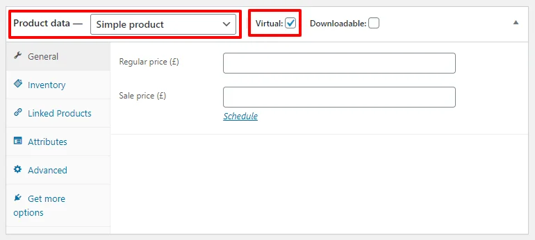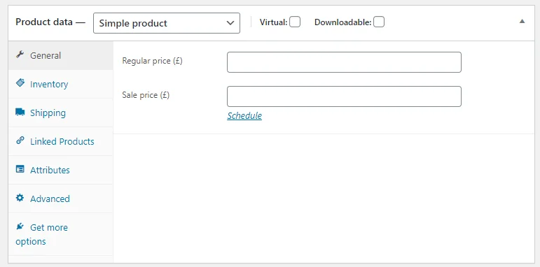 The Shipping tab is removed as a virtual product doesn’t need to be shipped.