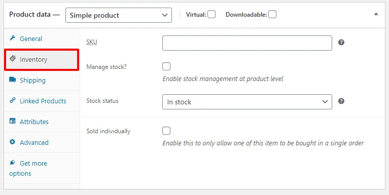 The inventory tab allows you add the SKU of the product and also to manage stocks. You can show the stock status of the product to the customer and alert them if the stock has finished.